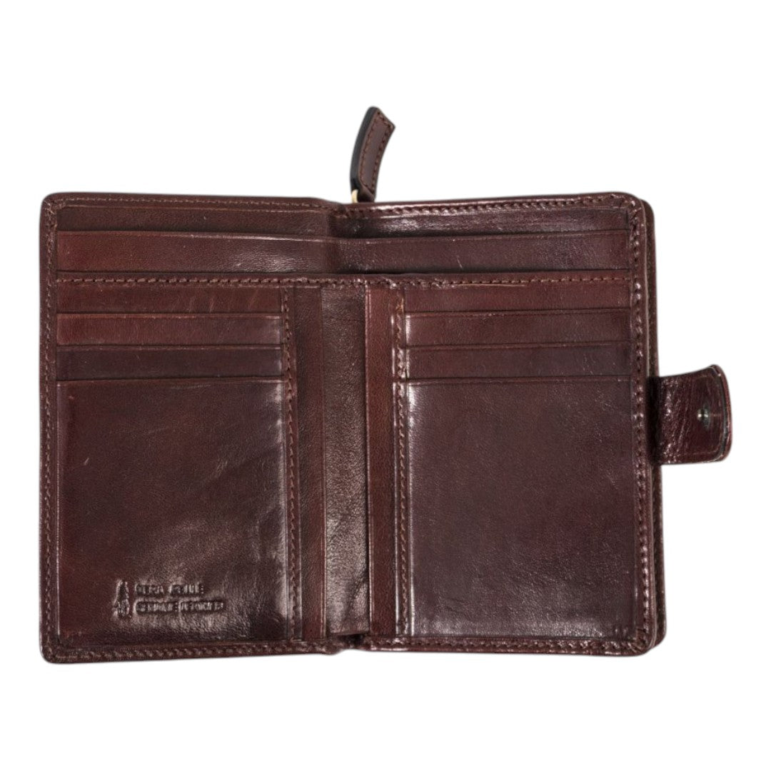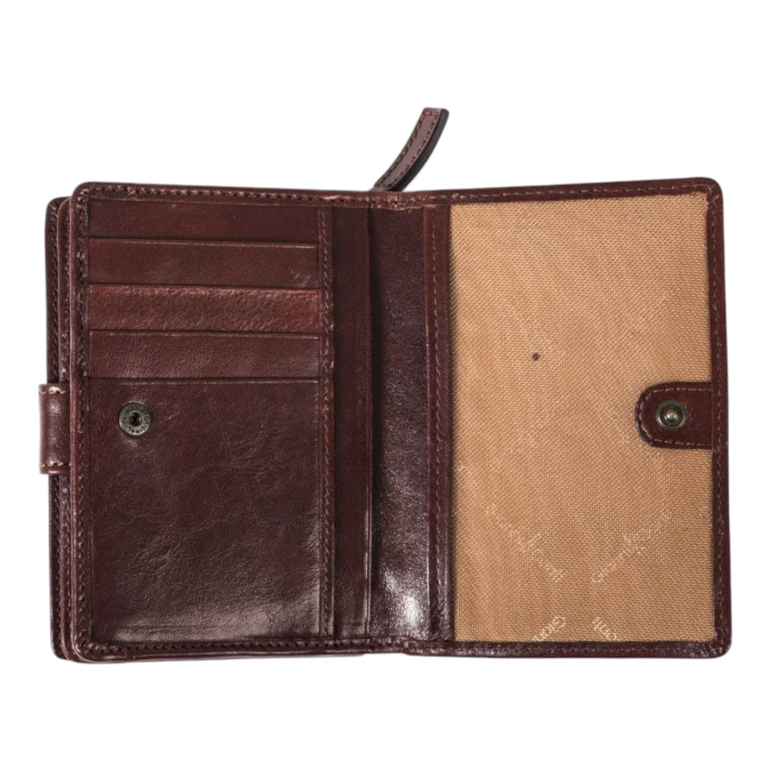 A structured tab ensures the wallet stays neatly closed, adding a layer of security and sophistication. The smooth leather finish and refined interior provide a touch of elegance, making this wallet perfect for both casual and formal settings.