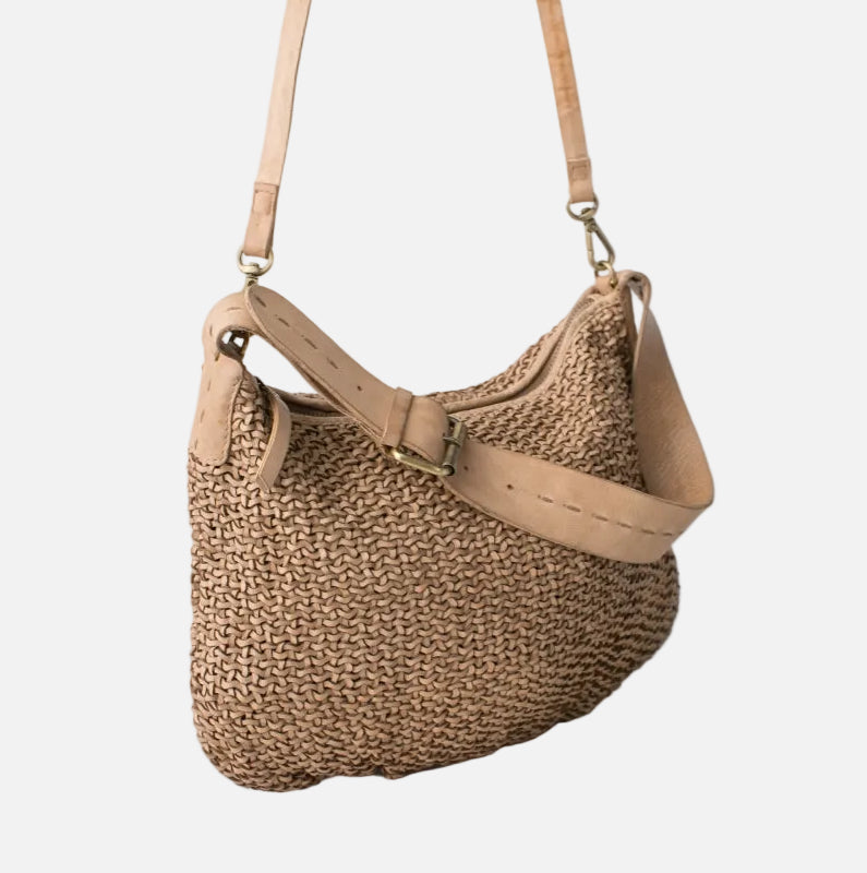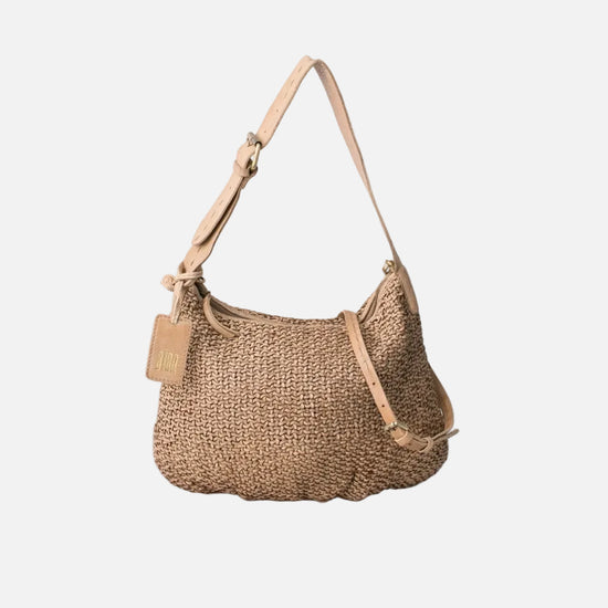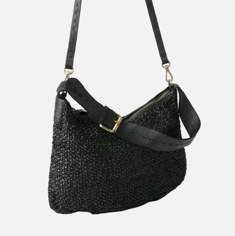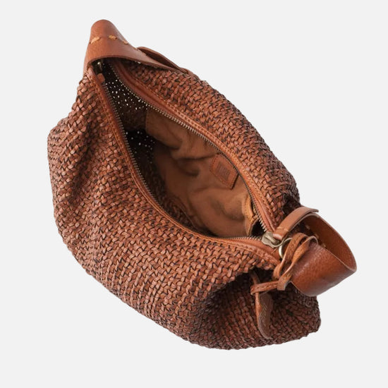 Mini hobo bag in washed, vegetable-tanned, hand-braided cowhide leather. Features a shoulder strap, adjustable and removable crossbody strap, zip closure, and is unlined but includes an interior cotton pocket.