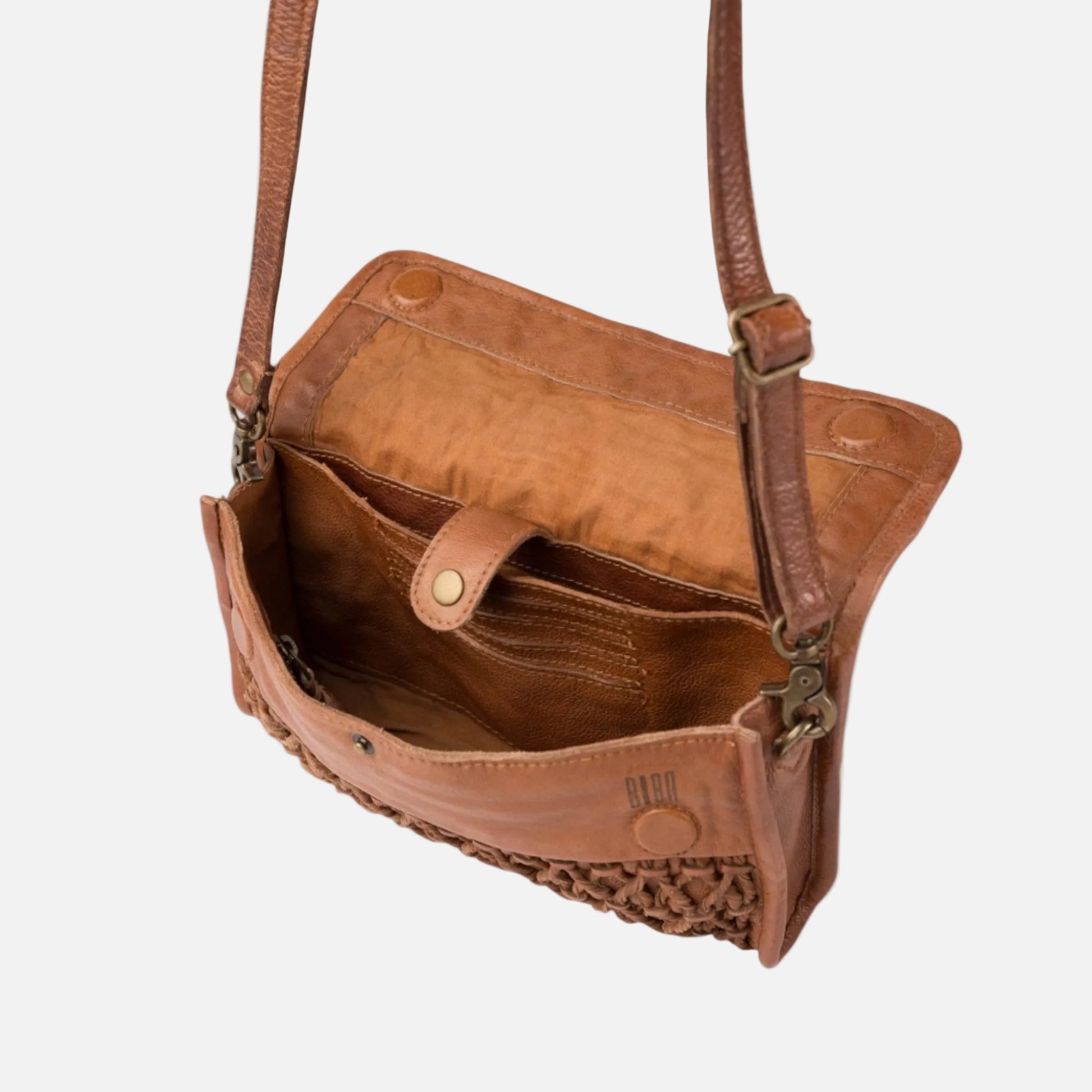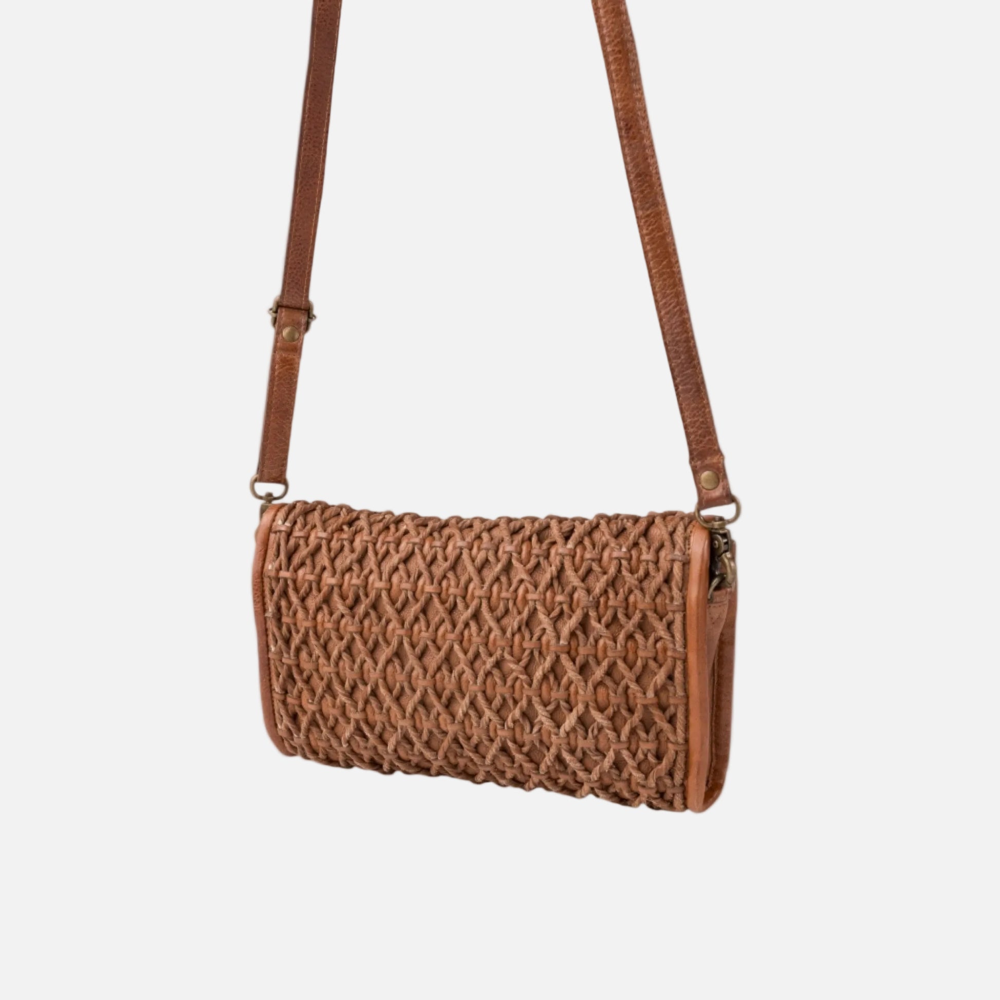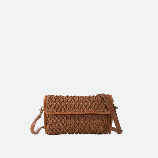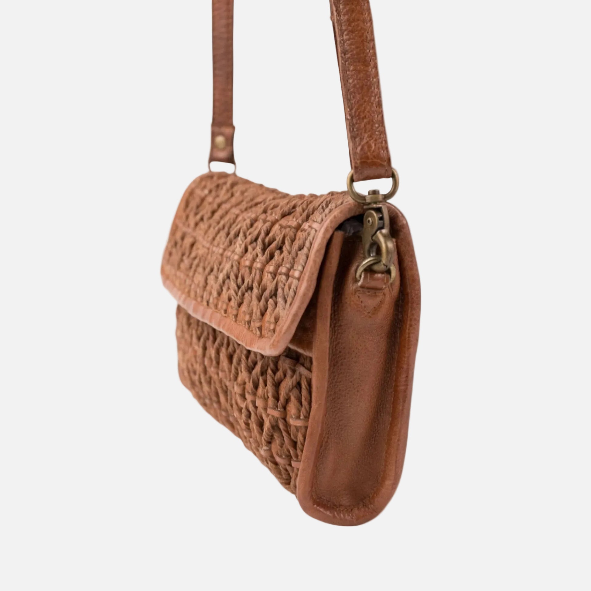 Washed, rolled, and braided cowhide crossbody bag. Flap closure with two magnets and an internal snap. Adjustable and removable shoulder strap. Multiple internal pockets. Cotton lining.