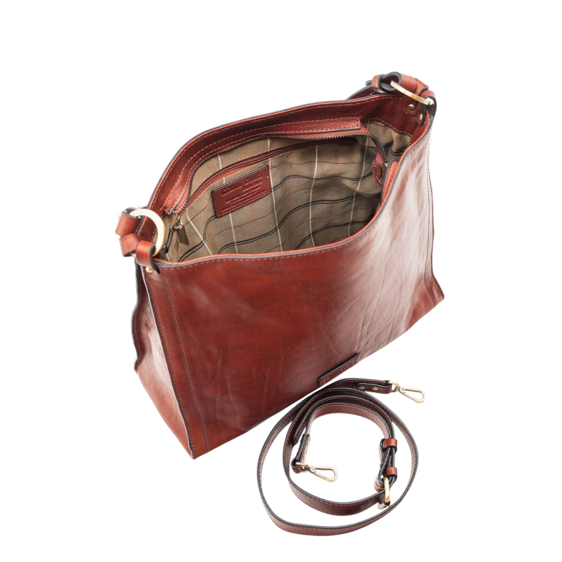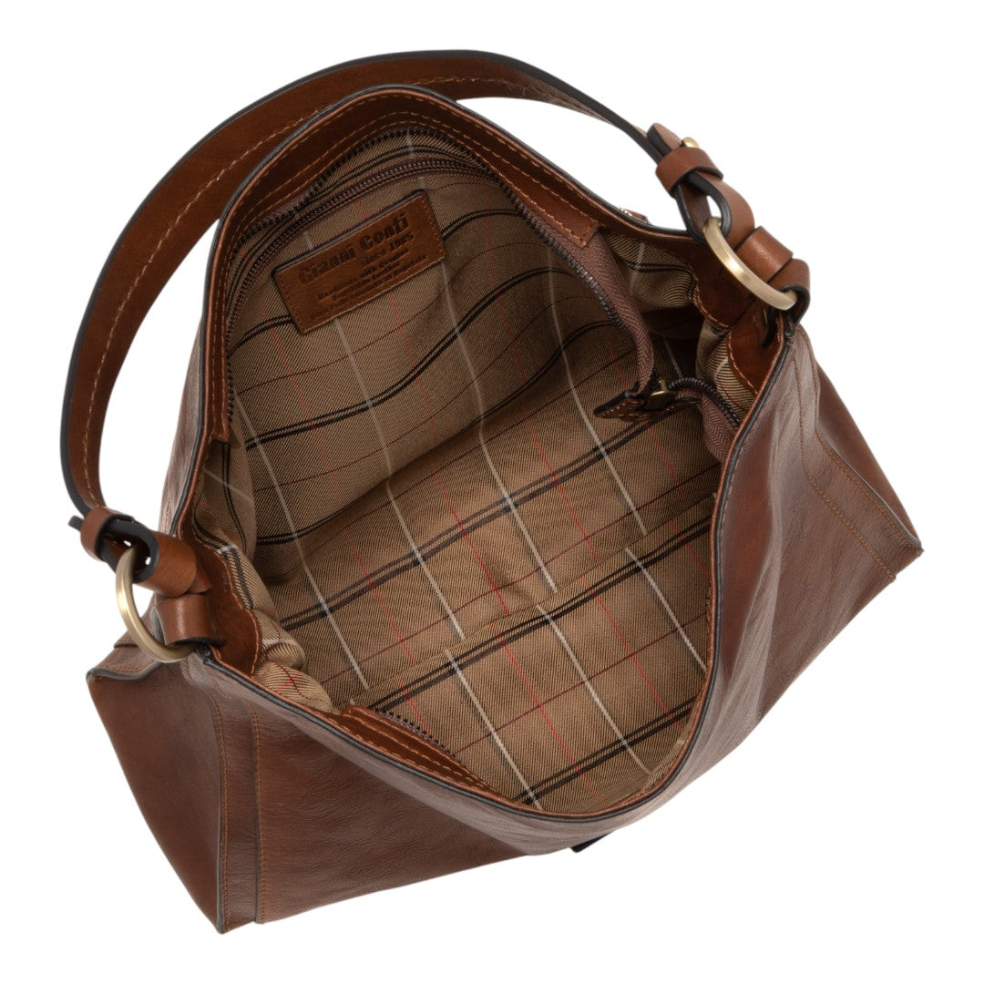 Presentamos nuestro bolso Hobo de cuero clásico, una combinación perfecta de elegancia y practicidad. Este bolso, confeccionado en cuero suave de alta calidad, ofrece un interior espacioso forrado con una elegante tela a cuadros, lo que garantiza que sus objetos esenciales estén seguros y sean de fácil acceso.