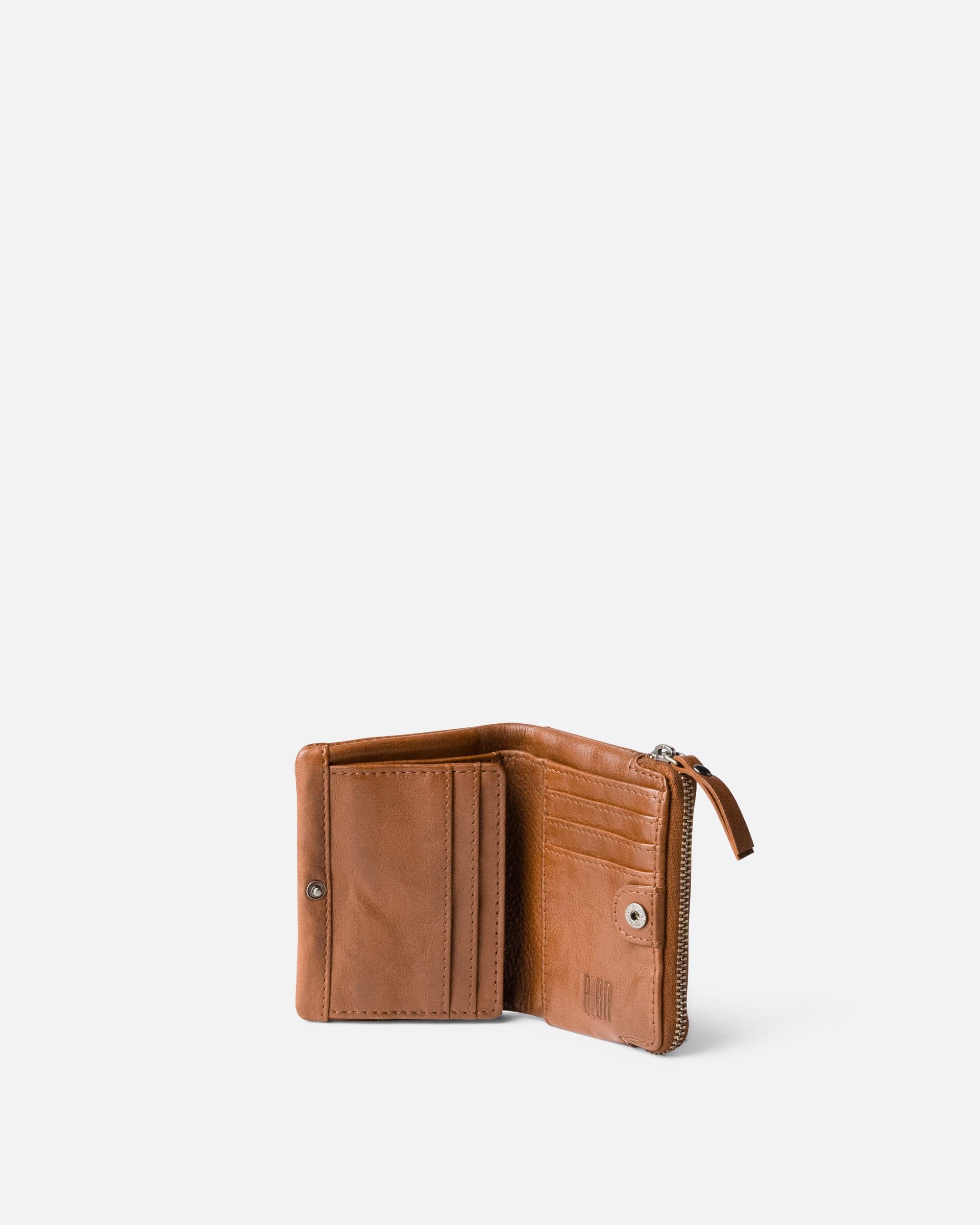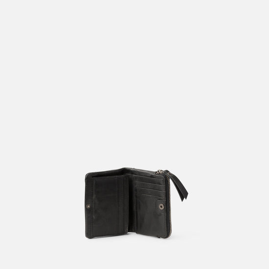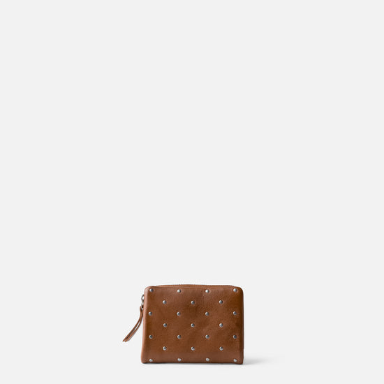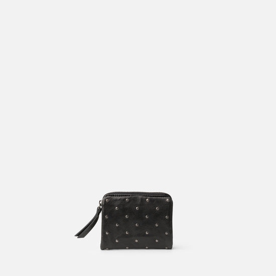 Small wallet in washed cowhide leather. Features small studs on the front. Button and zip closure. Compartments for bills, cards, and coins. RFID blocking.