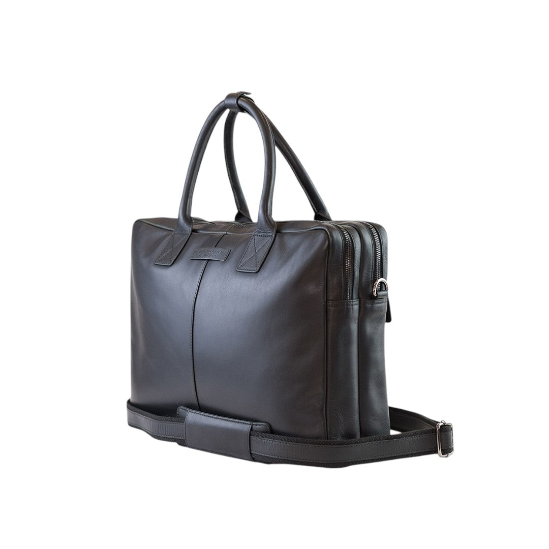 Functional yet elegant, this black leather briefcase transitions seamlessly from office to after-hours.